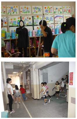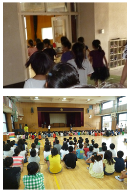不審者役の人が2階の教室に現れたので、全員講堂に避難しました。