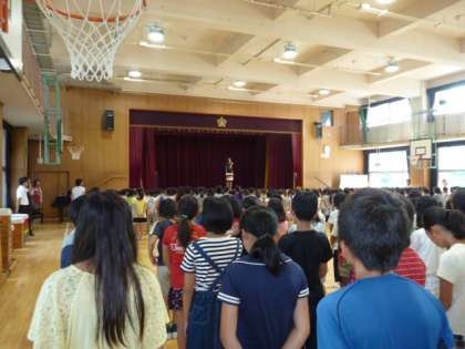 市歌・校歌斉唱の後、校長先生の話と夏休みのくらしについての話がありました。
