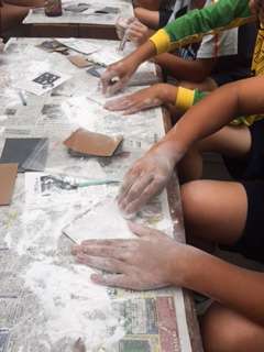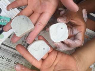 石をひたすら削って、勾玉の形にしていきます。手も顔も真っ白になりながら、削っていきます。