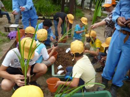 今日の6時間目、委員会の時間に花菖蒲の植え替えをしました。