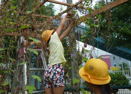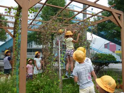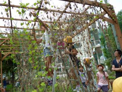 今朝、4年生の子どもたちがヒョウタンの収穫をしました。