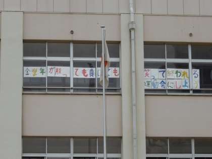 校舎3階の窓には、みんなで考えた運動会のめあてが代表委員会のメンバーによって掲示されました。