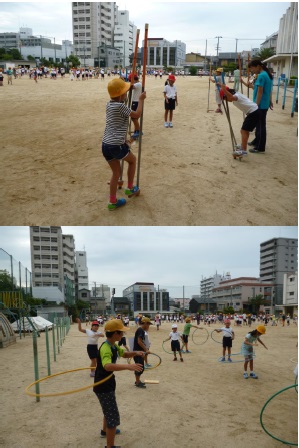 ドッジボールや鬼ごっこ、フラフープに竹馬遊びなど班の友だちと仲良く遊びました。