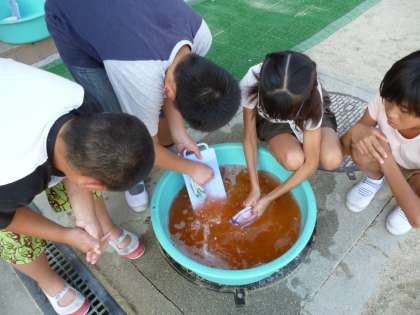 たらいの水は汚れで真っ茶色になっていました。