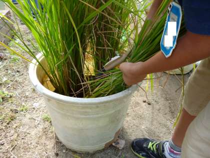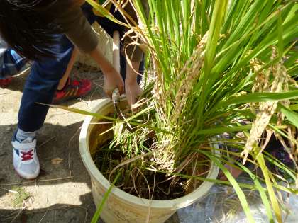 5年生は、バケツに植えてある稲の稲刈りをしました。