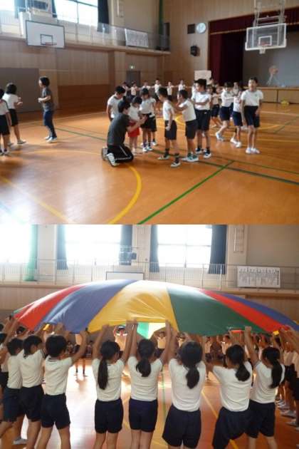 思斉特別支援学校の大きな体育館で、本校5年生と思斉校の5年生との交流会がありました。