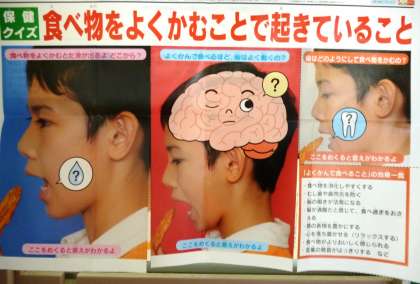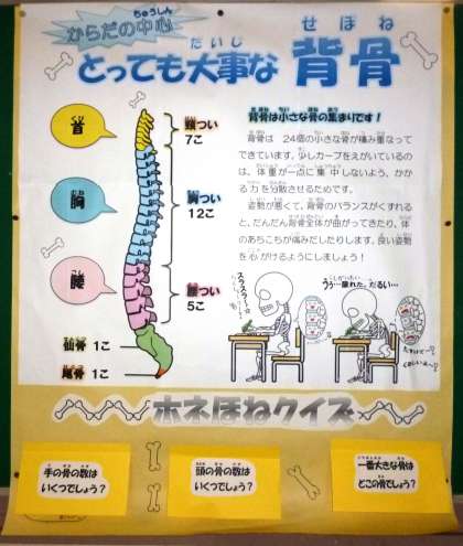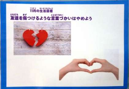 いつもイラストが工夫されている生活目標(11月)や、クイズなどがあり見ていてとても楽しい保健関係の掲示物があります。
