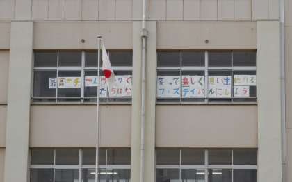 校舎の窓には、フェスティバルのめあてが張り出されています。