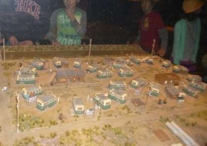 写真は、戦後に建設された仮設のバス住宅と昭和の初めの理髪店の模型です。