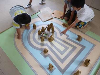 粘土でつくったミニ埴輪を古墳の絵の上の思い思いの場所に置いていきました。