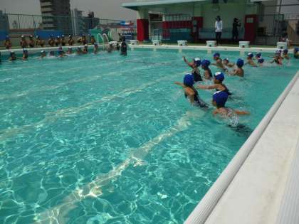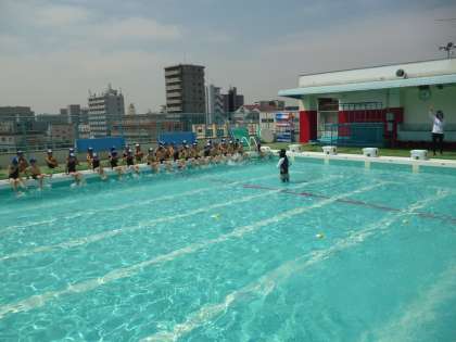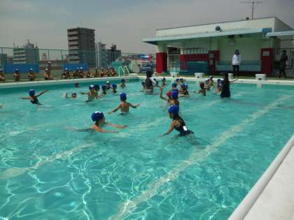 6年生までが使用する大きなプールなので、1年生が入る時は水位を下げて指導しています!
