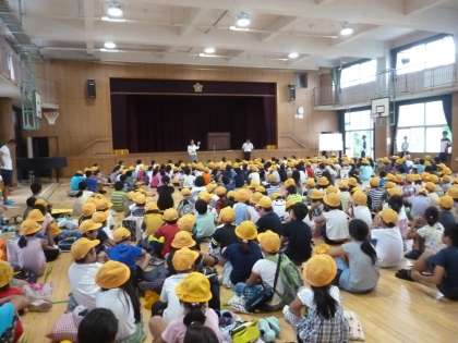 講堂に全員集合し、登校班ごとに下校しました。