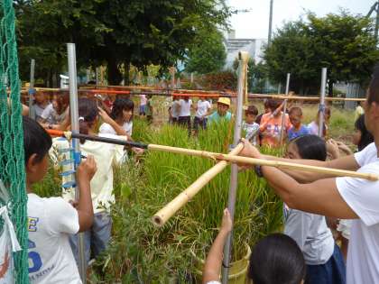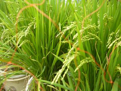 5年生が世話をしているバケツ稲の稲穂がだいぶ大きく成長してきました。