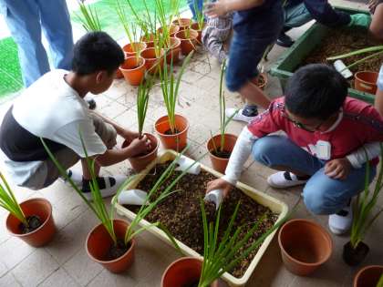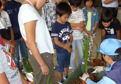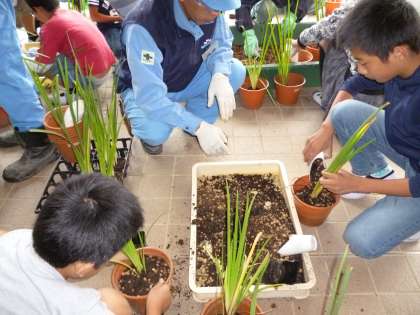飼育・栽培委員会の児童がビオトープにある花菖蒲を、より大きな鉢に植え替える作業をしました。