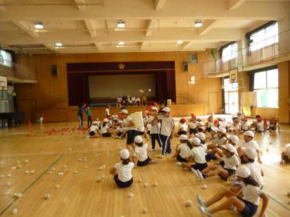 太子橋小の4年生は、お尻をつけて玉入れをしました。