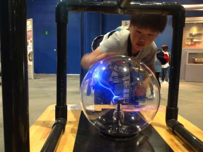 ガラス球の中の青い光は、『かみなりのあかちゃん』だそうです。手を触れたところに放電されるそうですよ!!