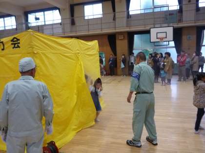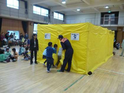 2年生の防災訓練では、煙体験ハウスの中を通りました。