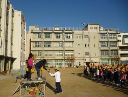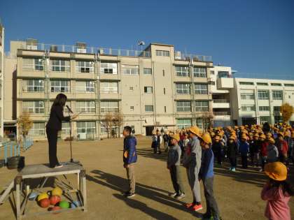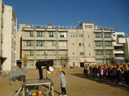 冴えわたる青空のもと、児童朝会が行われました。