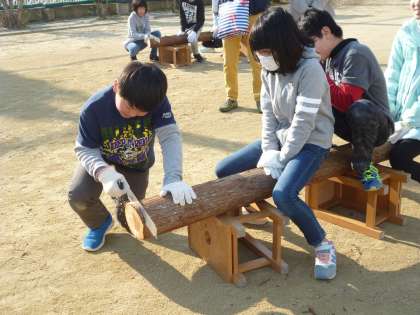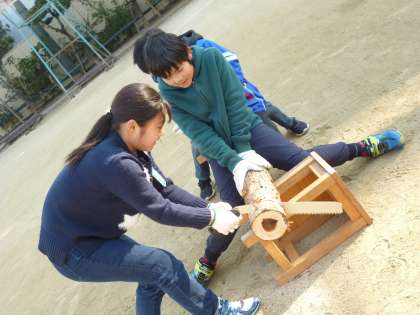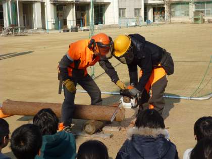 のこぎりやチェーンソーを使って木を切る活動をしました。