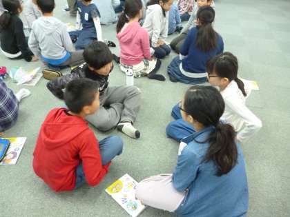 はじめに教科書のさし絵の中から英単語を見つけ出す活動をしました。