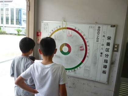 次は、給食委員会が毎日の献立を『3つの食品群』に分けて掲示してくれているところです。