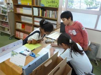 最後は、図書委員会が昼の『図書室開放』の様子を図書室開放日誌に記録しているところです。