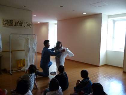 工場内にある化学防護服の試着体験ができました。