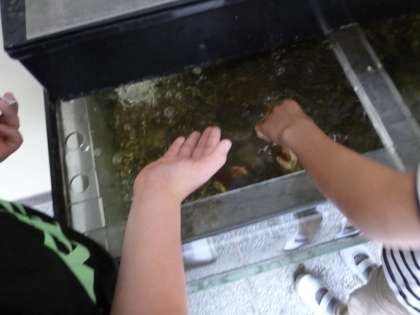 水槽や水中オブジェの橋の苔をとったりエサをあげたりしています。
