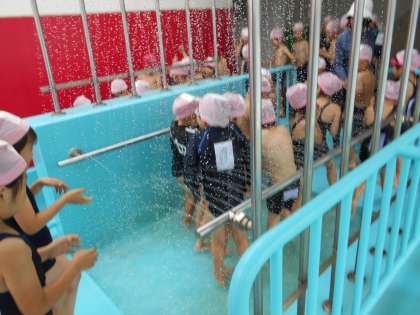 冷たいシャワーを浴びて、子どもたちは大騒ぎ!!