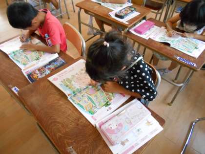 『なにを して いるかな』という資料を使って、『よい ことと わるい こと』について考えました。