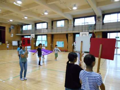 児童入場の時、膝を高く上げることや『校旗』がたるまないように張って持つこと、各学年のプラカードをまっすぐ持ちながら行進することなどを練習をしていました。