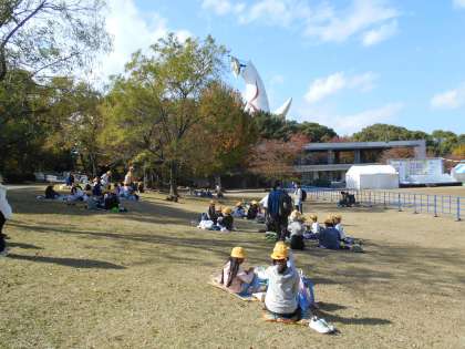 高くそびえる「太陽の塔」がよく見える広場にシートを広げ、みんなで「いただきます!」と元気よく挨拶をしました。