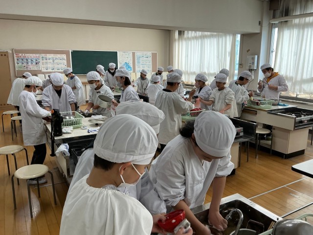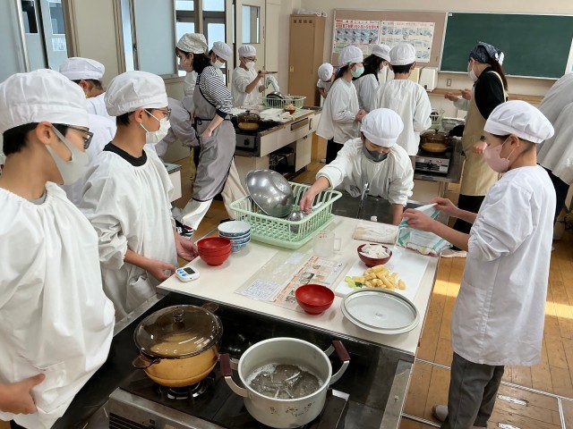 5年生が家庭科の学習で、日本の伝統的な日常食である「ごはん」と「みそ汁」の調理実習に取り組みました。