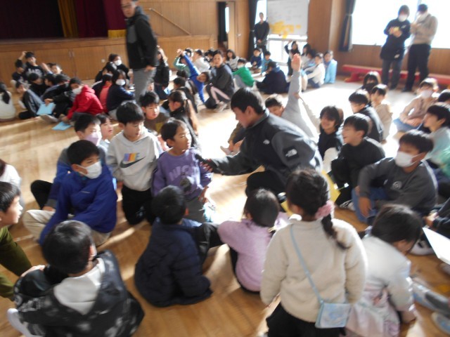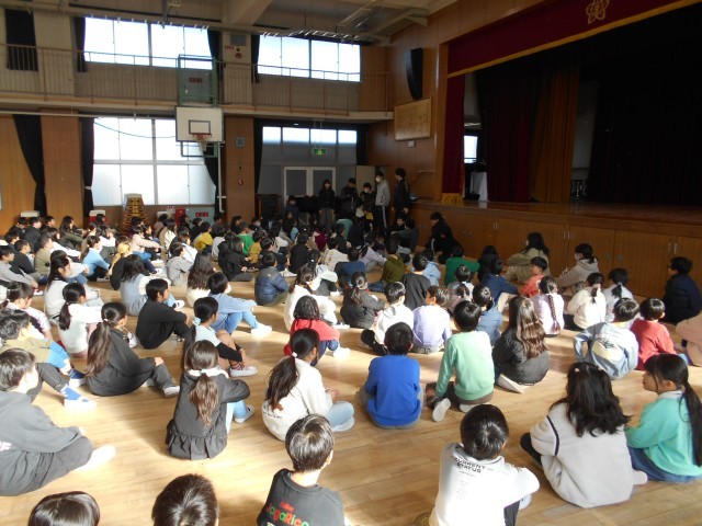 全学年が講堂に集まって、にこにこ班活動をしました。「この声はだれでしょう?」というクイズを3問、児童会が準備してくれました。班で輪になって、どの先生の声なのか静かに聞いて考えていました。たくさんの班が全問正解していました。とても楽しい会になりました。