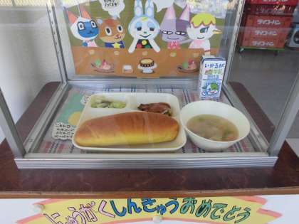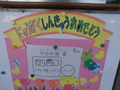 給食が始まりました。1年生にとっては、小学校生活初めての給食です。後で聞きましたが、1年生もしっかり食べたそうです。メニューは、パンプキンパン、スープ、豚肉のデミグラスソース、キャベツとピーマンのソテーです。しっかり食べて元気に学校生活を送ってほしいと思います。
