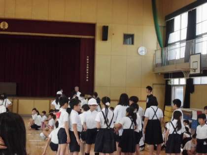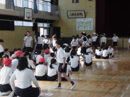 児童集会です。集会委員会の担当でした。「並び替えゲーム」をしました。集会委員会の指示を聞き、その通りに順番に並び替えるゲームです。