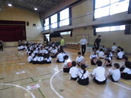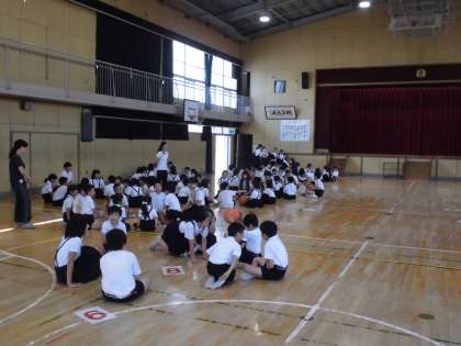 児童集会です。集会委員会の進行で「ばくだんゲーム」をしました。音楽が止まった時にボールを持っていた人が、自己紹介かものまねをします。みんな自分のところで止まらないように急いでボールを送っていました。ボールを持ってしまった人は、恥ずかしそうに自己紹介をしていました。和やかにゲームを楽しむことができました。