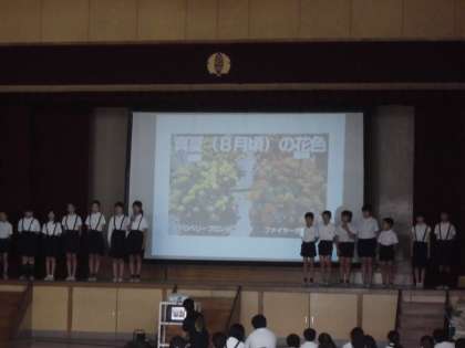 児童集会です。環境美化委員会の発表です。5月に行った一人一鉢の花の紹介をしました。地域からも、「とてもきれいですね。」と言われている一人一鉢の取り組みはずっと続いています。各学年が育てている植物の特徴を、委員会のメンバーがわかりやすく説明をしてくれました。植物についてよくわかりました。そのようなことを意識して水やりなどをして大切に育ててほしいなと思います。