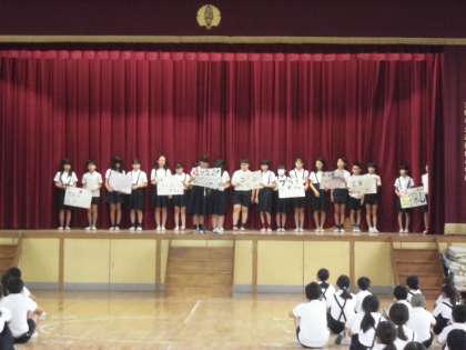 児童集会です。今回は、土曜日に行われる高殿南フェスティバルのお店紹介をしました。リーダーとなる6年生がルール説明などお店のアピールをしました。どのお店もとてもおもしろそうです。詳しいお店の様子は当日の様子としてまたお伝えする予定です。
