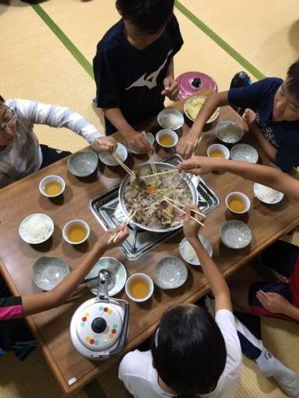 1日目の夕食は、鴨鍋です。「鴨鍋はじめて食べる〜」という声もたくさん聞こえてきました。全ての班が鴨鍋を食べきり、たくさんご飯もお代わりしました。林間でも、給食と同じように完食です。