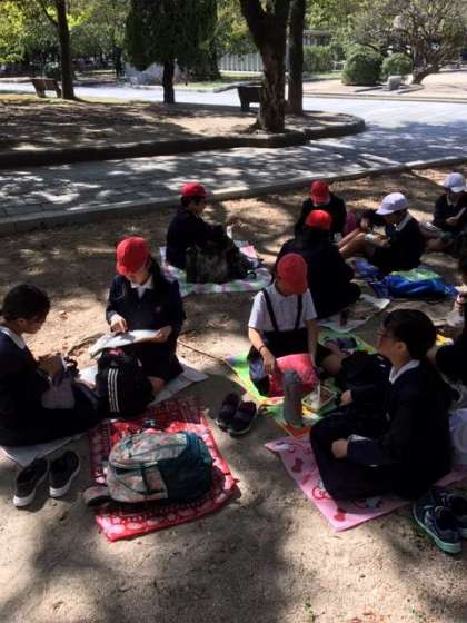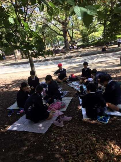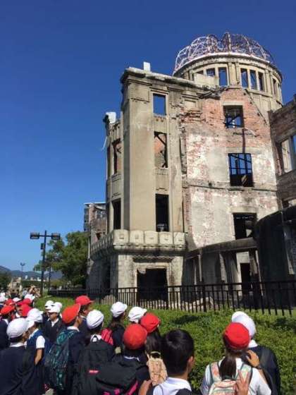 広島に到着しました。まず、原爆ドームを見学しました。その後、昼食をとりました。原爆ドームと昼食の様子です。青空がきれいでとてもいい天気です。
