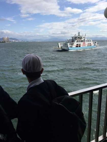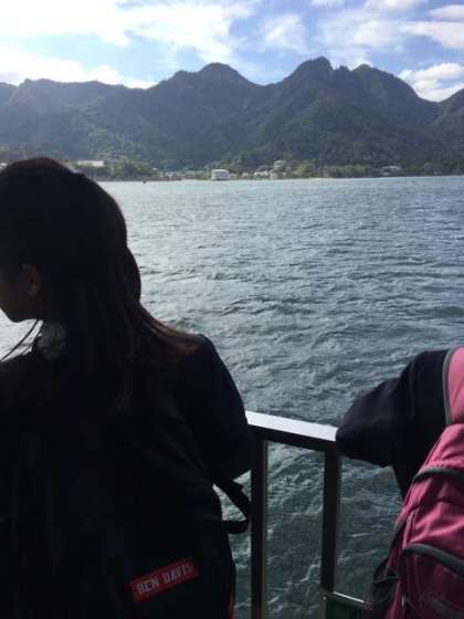 宮島に向かう船の中からです。今日の広島も天気はいいですが、風がとても強いそうです。