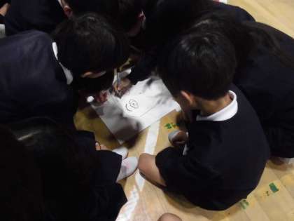 児童集会です。今回の集会は集会委員会が進めました。内容は、自分のなかよしグループ担当の先生の似顔絵をグループみんなで描くというものです。顔のそれぞれのパーツをグループみんなで分担して描き進めました。みんなで協力して担当の先生の顔を仕上げました。特徴をとらえたそっくりな顔もいくつかありました。後で、2年生が着色して、それぞれの先生方に渡されました。