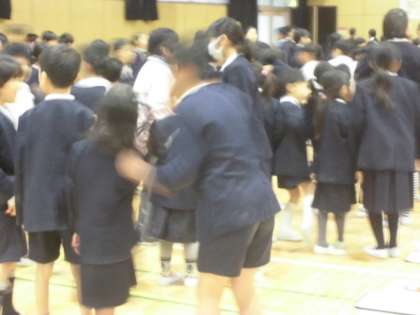 児童集会です。今回は運営委員会の進行です。伝言ゲームをなかよしグループでしました。6年生が伝える言葉を聞き、その後1年生から順番に伝言していきます。最後は、また別の6年生に伝えます。途中で言葉が変わるとおかしくなりますが、正しく伝えることができたかどうかは、定かではありませんがどうだったでしょうか。