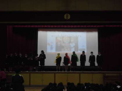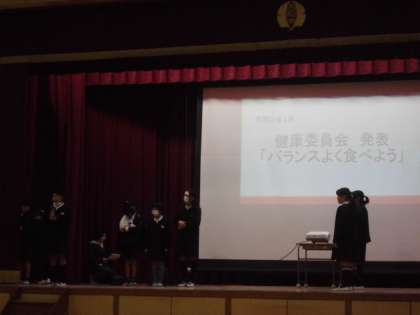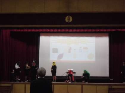 児童集会です。今回は健康委員会の発表です。バランスよく食べようというテーマで劇を通して発表をしました。3色レンジャー(赤・黄・緑)が登場したときは子どもたちから歓声が上がりました。それぞれの食べ物のはたらきを紹介し、低学年でもわかるような劇の内容でとても分かりやすかったです。