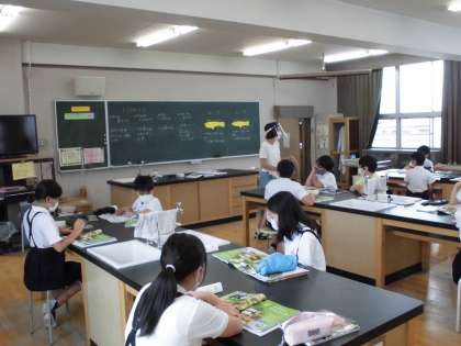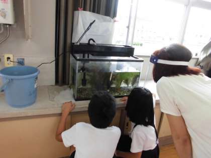 5年生は理科の学習で、大切に育ててきたメダカの観察を通してメダカの体のつくりを学習しました。