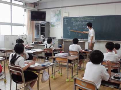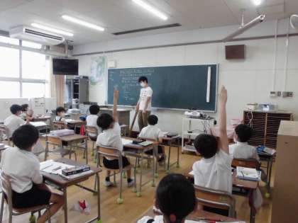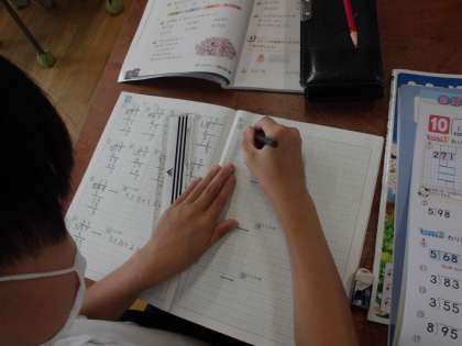 4年生は算数でわり算のひっ算の計算のしかたを学習しています。先生の話をしっかり聞いて、発表も頑張っています。学習の定着を図るために、計算ドリルの問題にも取り組みました。