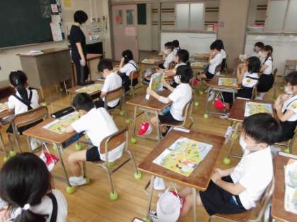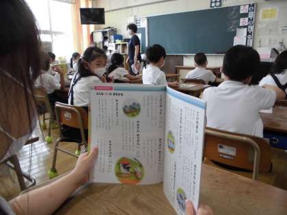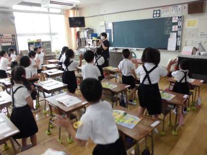 音楽の学習では、教科書に載っている歌を聴きました。知っている曲がたくさんあり、思わず口ずさみたくなっていました。そのあとは、手拍子や足ふみでリズム遊びをしました。