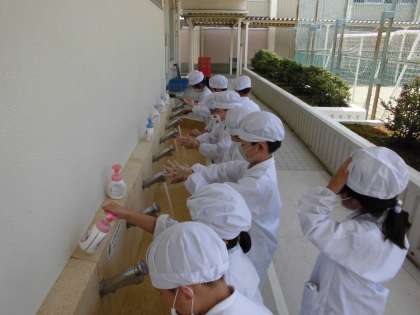 しっかり手洗いをして、教室では自分の給食や牛乳を順番に取りに行きます。