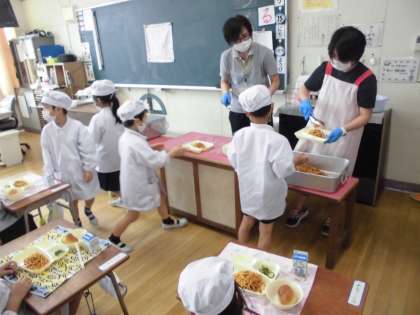 給食が始まって2週間、1年生の子どもたちも慣れてきました。